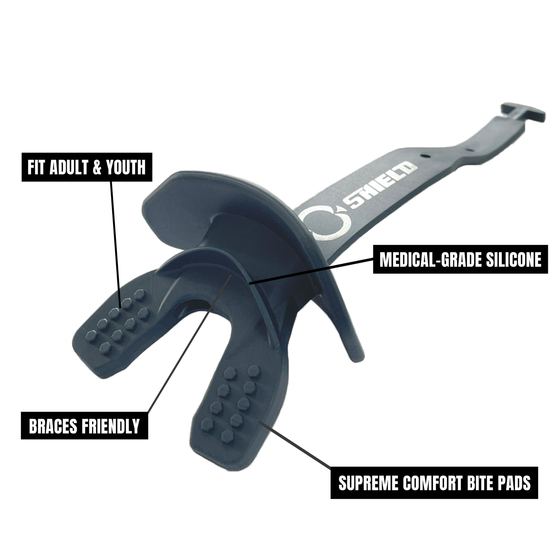 O Shield Striker mouthguard, football lip guard, high airflow mouthpiece, lip protector mouthguard, football mouthguard with airflow channel, no-boil mouthguard, youth football mouthguard, adult football mouthguard, lip shield mouthpiece, football gear accessories, breathable lip guard, football mouthguard black, football mouthguard chrome, extra airflow sports mouthpiece, football protective gear for youth and adults, O Shield lip protector.